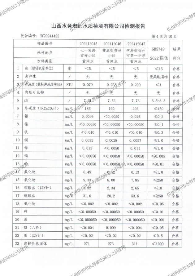 忻州城區(qū)公共供水水源水、出廠水、管網(wǎng)水、管網(wǎng)末梢水2024年12月份水質(zhì)信息公示