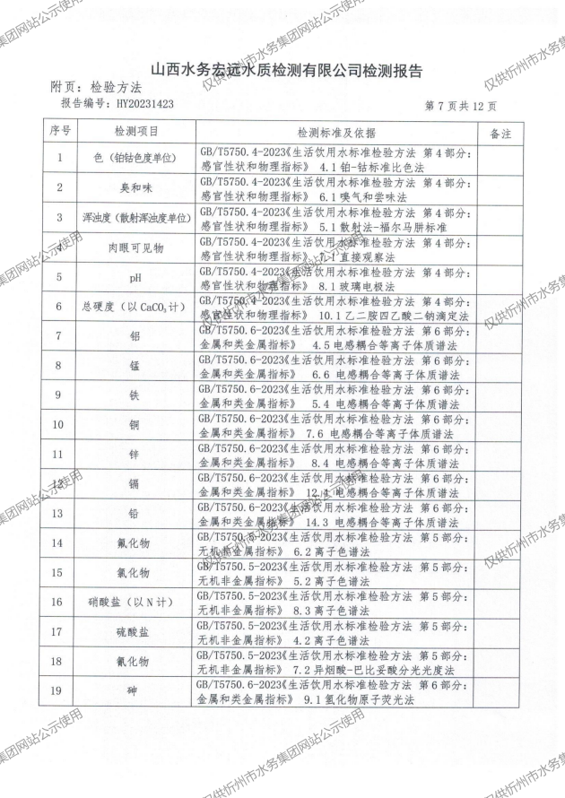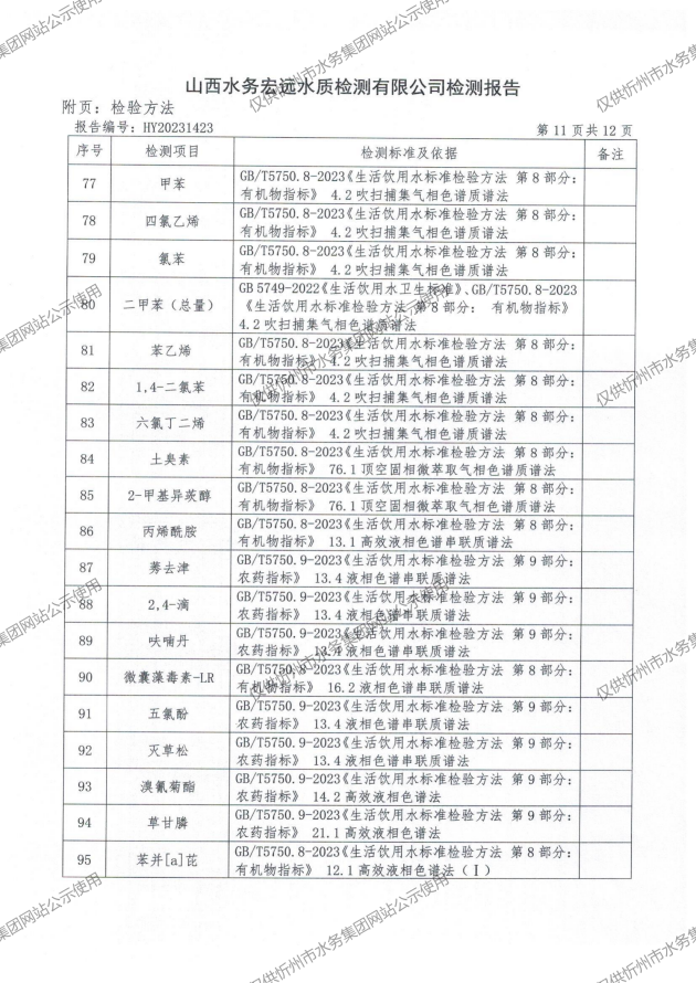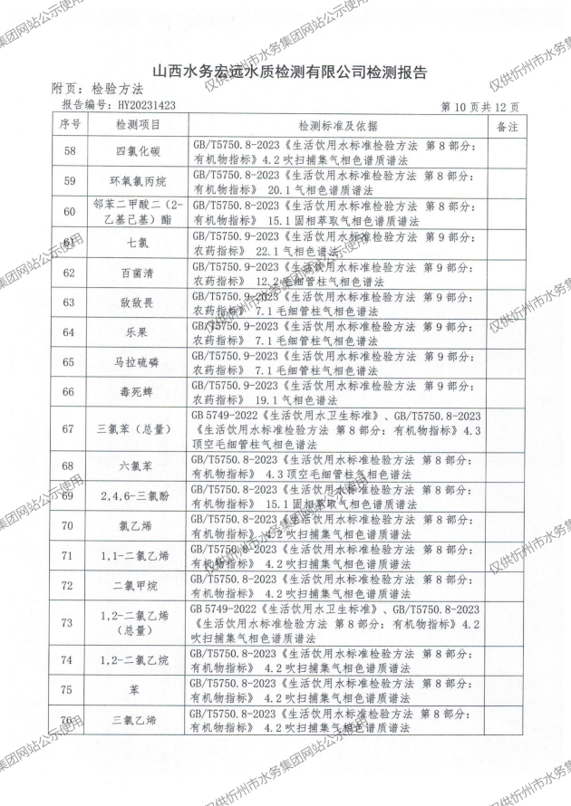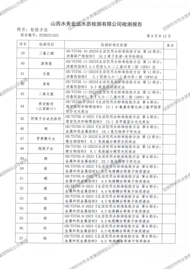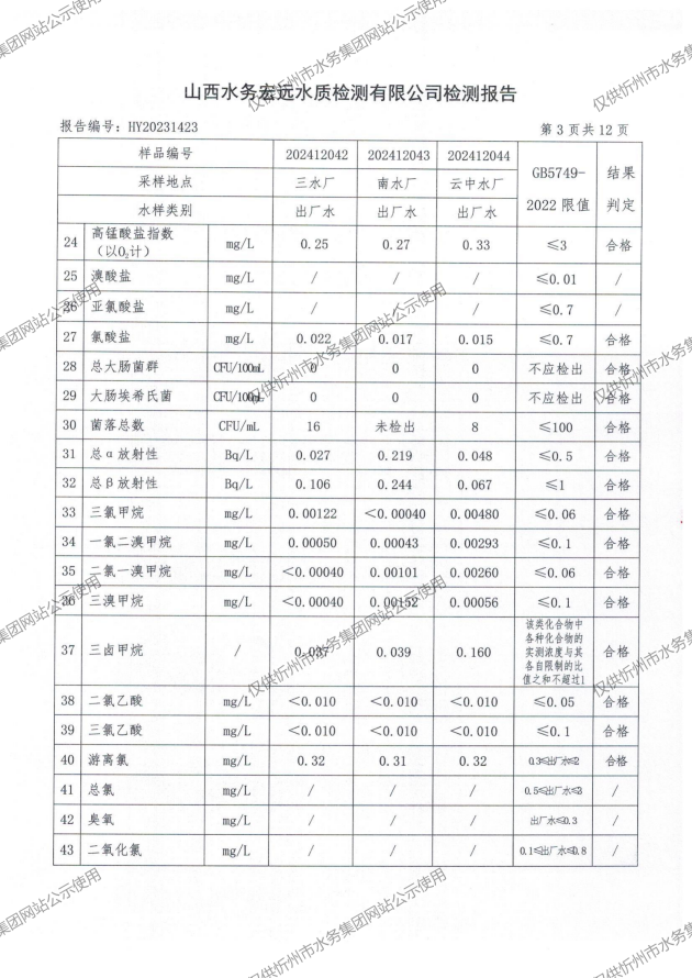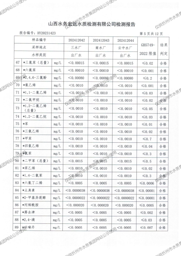2024年忻州城區(qū)公共供水南水廠、三水廠、云中水廠出廠水97項水質全分析
