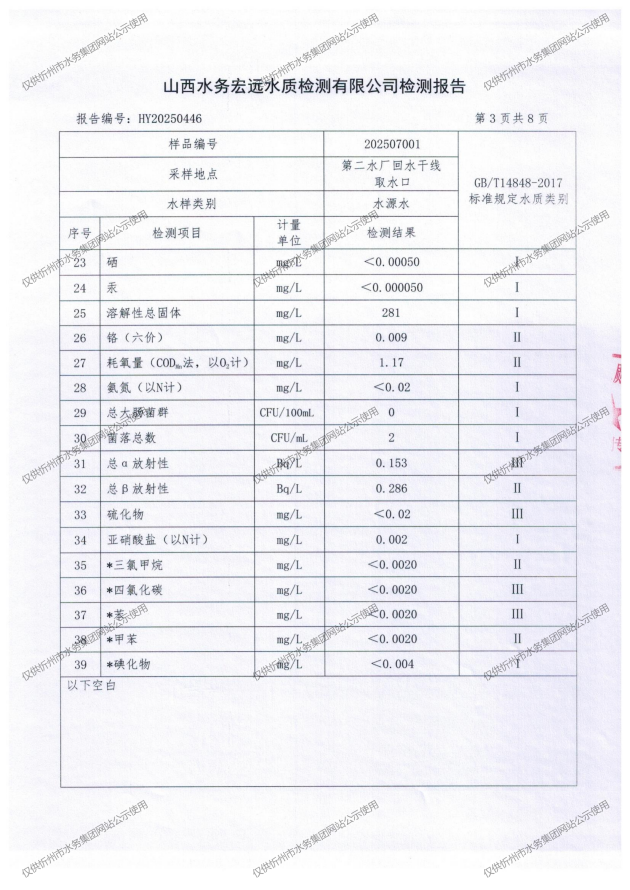 忻州城區(qū)公共供水水源水、出廠水、管網(wǎng)水、管網(wǎng)末梢水2025年7月份水質信息公示