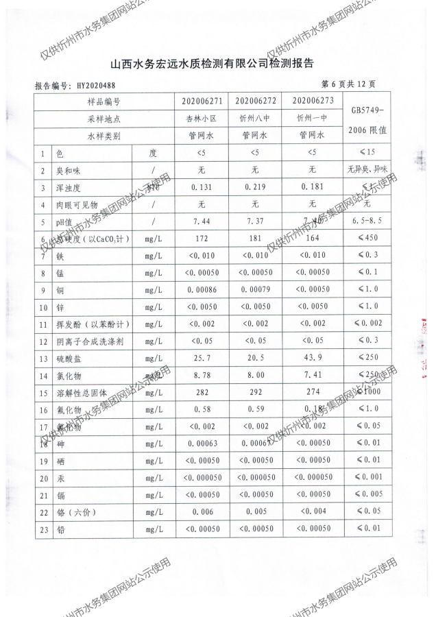 忻州城區(qū)公共供水水源水、出廠水、管網(wǎng)水、管網(wǎng)末梢水2020年7月份水質信息公示