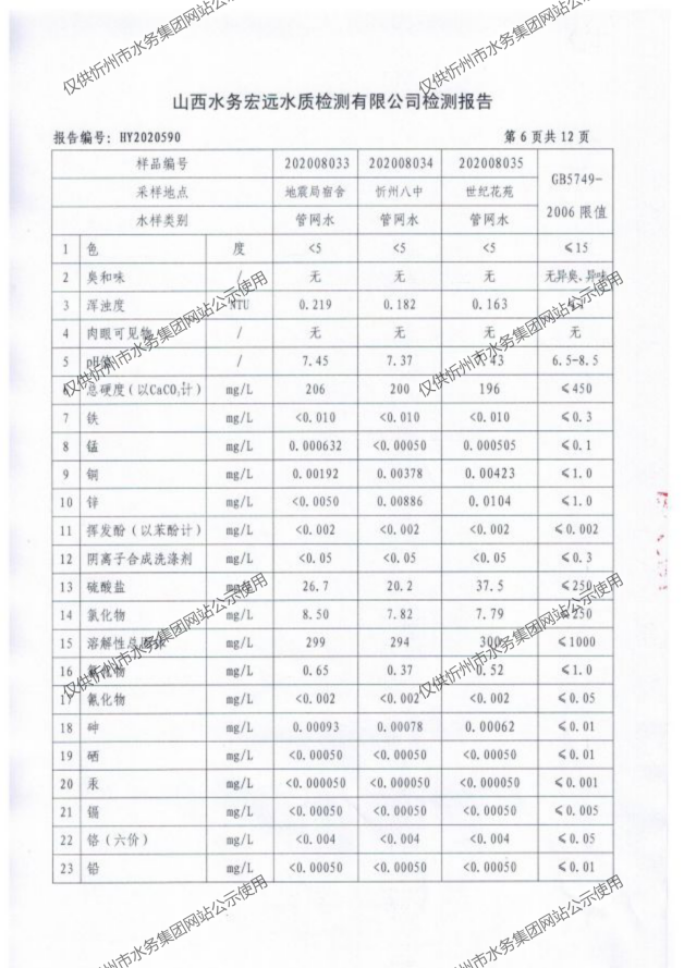 忻州城區(qū)公共供水水源水、出廠水、管網(wǎng)水、管網(wǎng)末梢水2020年8月份水質(zhì)信息公示